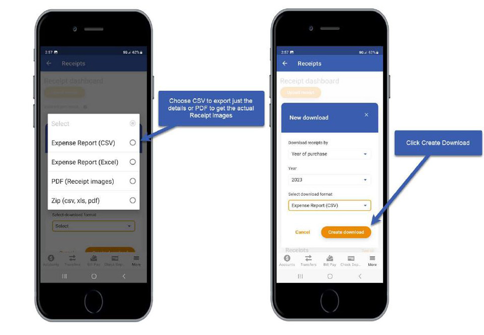 Log into the mobile app and access Digital Receipts. Click New Download. Select the Time Frame and File Format.